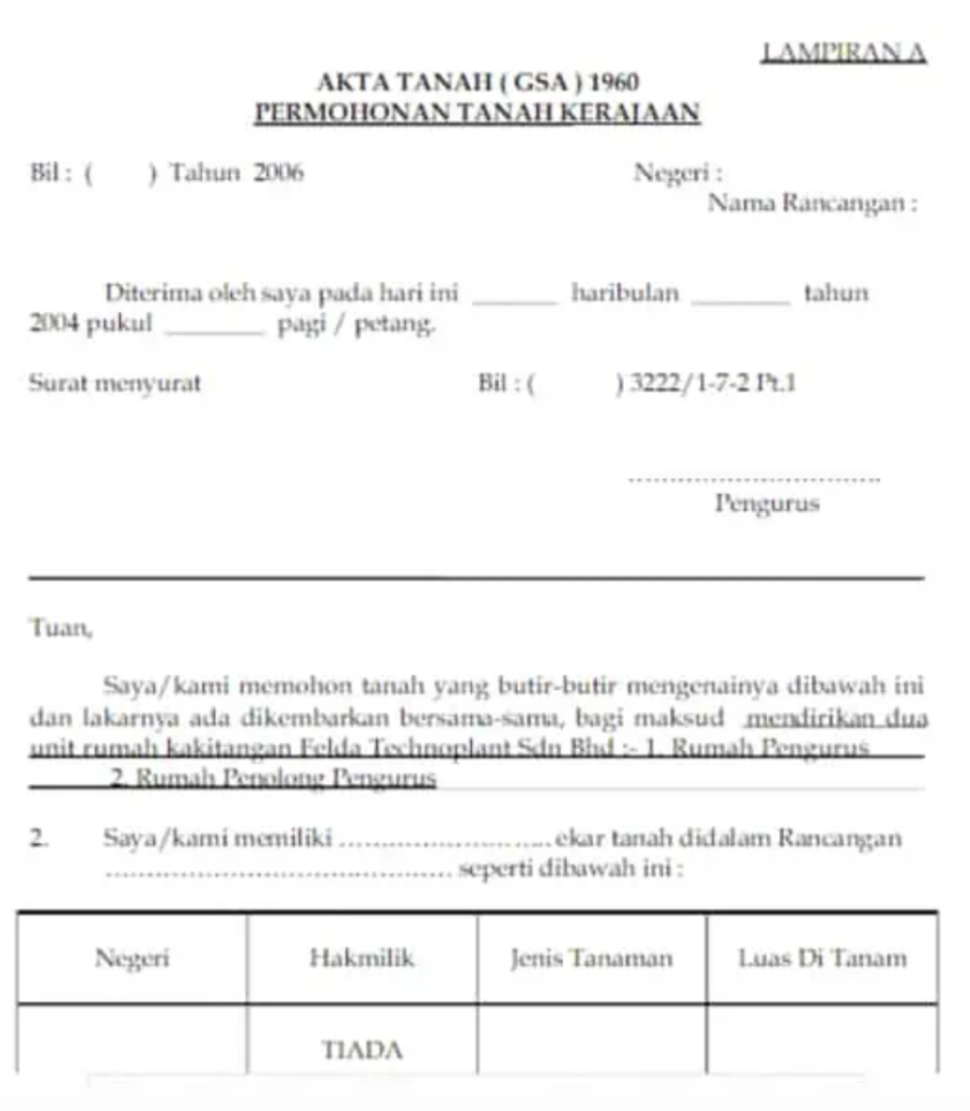 Rajah di bawah adalah contoh Borang Permohonan Rumah untuk Tanah FELDA.